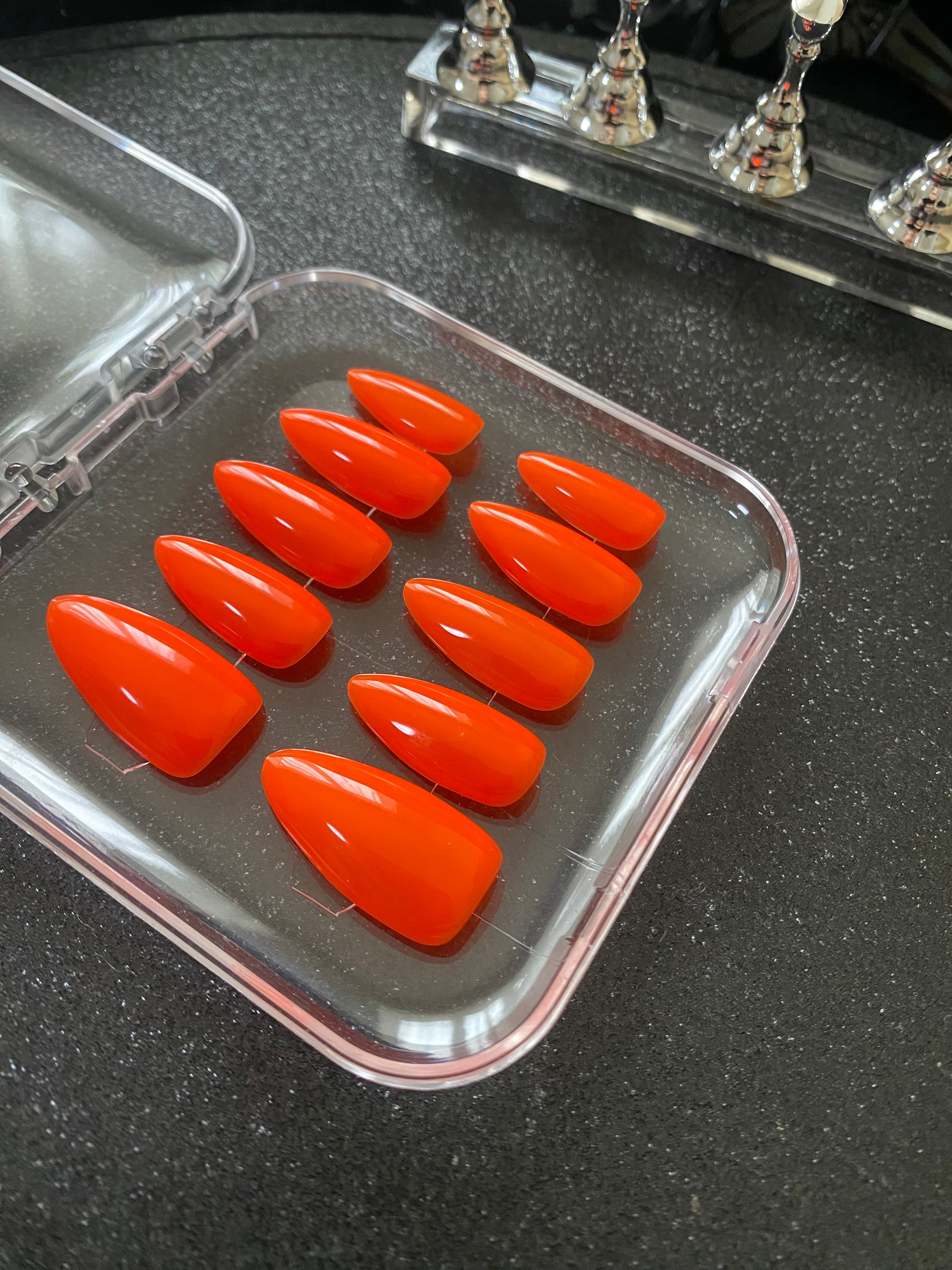 Apporte une touche d'énergie et de glamour à ton look avec les Solar Flame press-on nails. Leur teinte orange vibrante et leur finition ultra brillante captent la lumière pour un effet chic et audacieux. Leur forme amande élégante allonge naturellement les doigts et convient à toutes les occasions.